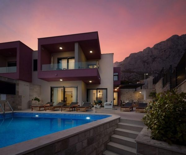 Ez a modern sorház egy telken található, melynek összterülete kb. 665 m² (két ikerházra osztva) és kb. 207 m². A ház Makarska csendes részén található. Makarska egy festői tengerparti város Horvátországban, amely lenyűgöző strandjairól, kristálytiszta türkizkék vizéről és a Biokovo-hegység lélegzetelállító kilátásáról ismert, amelyek a ház hátterében húzódnak.