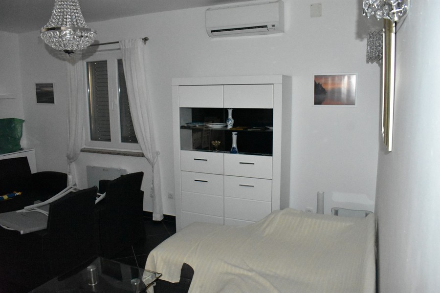 Középemelet: lakás két hálószobával és két fürdőszobával. a felső teraszokról a tengerre nyílik kilátás. A középső emeleti lakás bútorozott, légkondicionált.