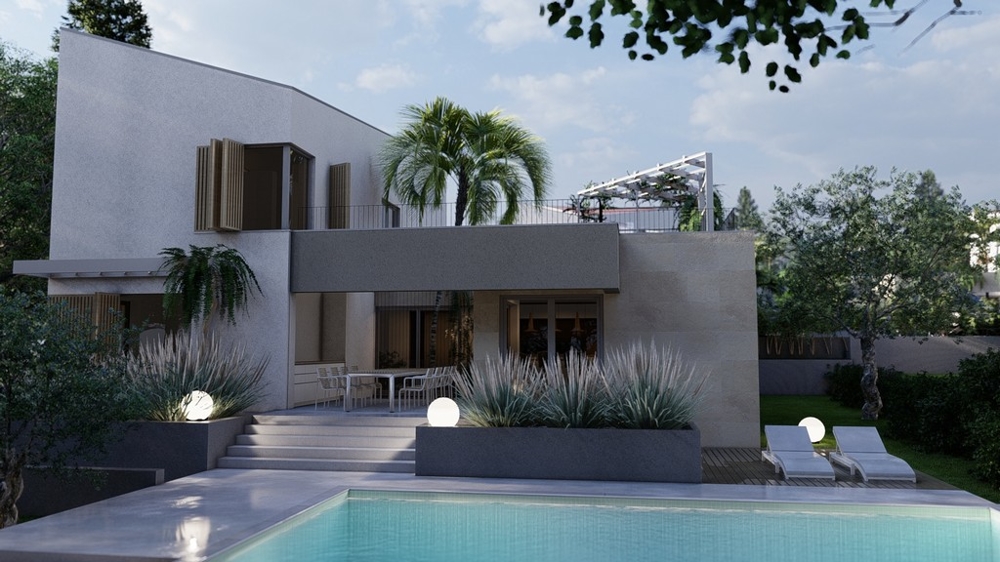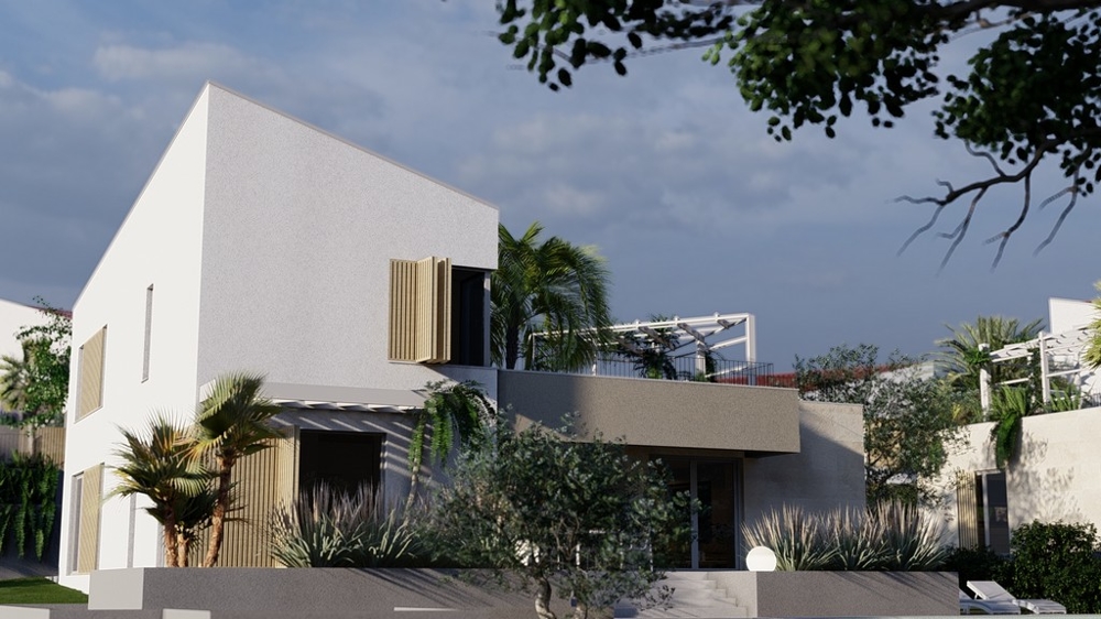 Modern, új építésű villa saját medencével és tengerre néző kilátással a környéken