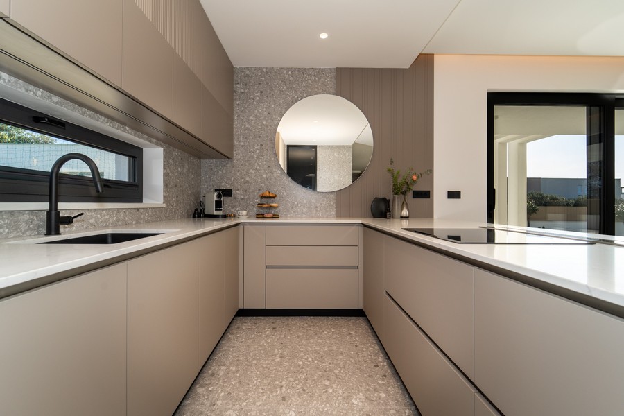Földszint: Nappali amerikai konyhás étkezővel, előszoba, fürdőszoba, fitneszterem és szauna, tároló, technikai helyiség, terasz Felső szinten: 3 hálószoba mindegyikhez saját fürdőszobával (2 hálószoba saját gardróbbal), tárolóhelyiség, fedett terasz A villához külön szabadtéri taverna/nyári konyha tartozik. Ezenkívül kosárlabdapálya/sportpálya, játszótér, medence napozóterasszal és három parkolóhely elektromos töltőállomással.