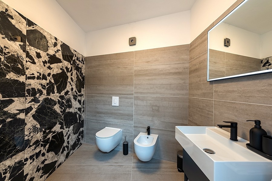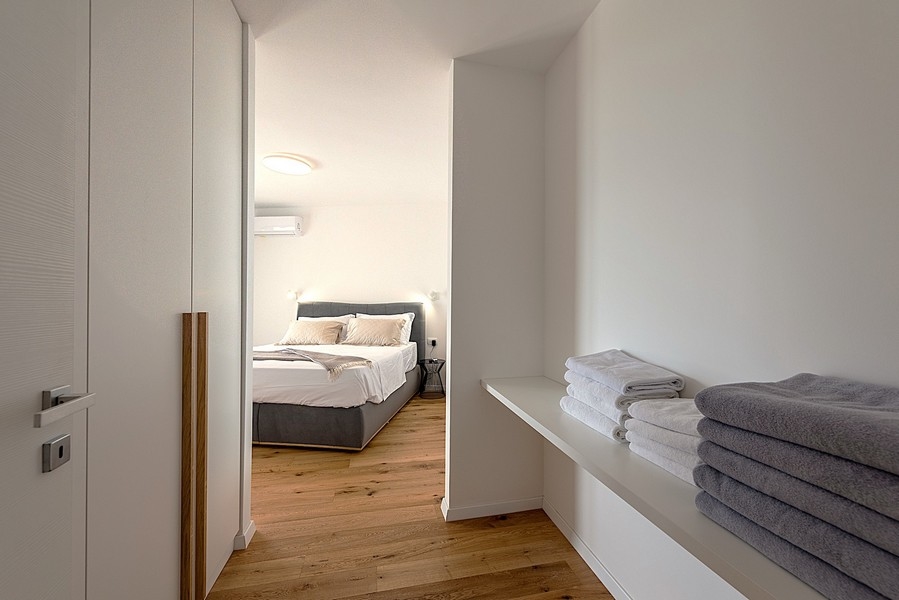 Az ingatlanon (kb. 350 m²) található egy fűtött medence napozóterasszal és egy fedett terasz gyönyörű kilátással a tengerre. A ház jó minőségű bútorokkal, klímával és padlófűtéssel eladó. Az ikerház lakóegységként szerepel az ingatlan-nyilvántartásban (ahogyan ez Horvátországban gyakran előfordul).