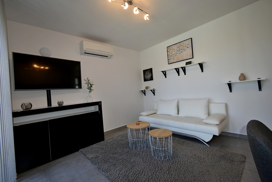 A felső szinten egy apartman található három hálószobával, két fürdőszobával, kamrával, egy nappali konyhával és étkezővel, valamint egy fedett terasszal, gyönyörű kilátással a tengerre.