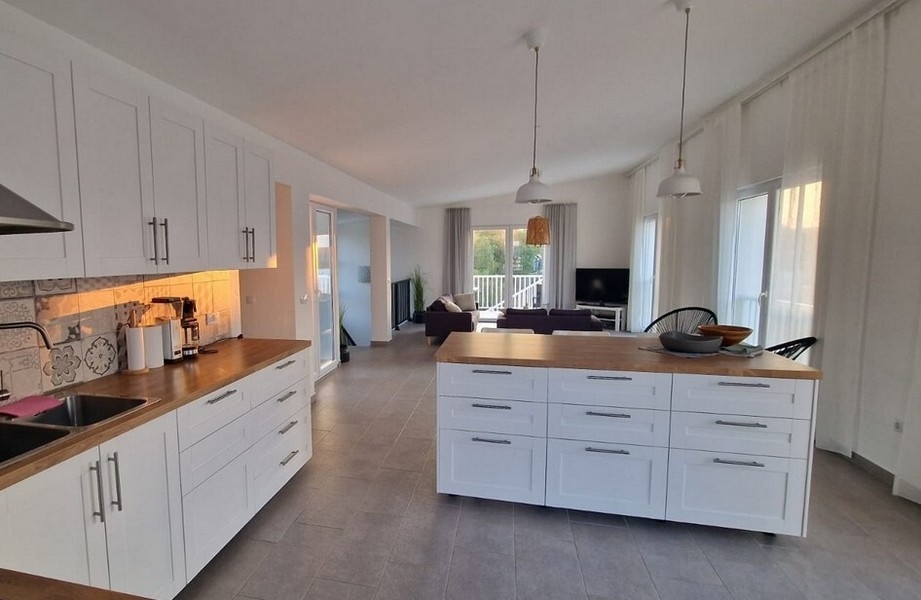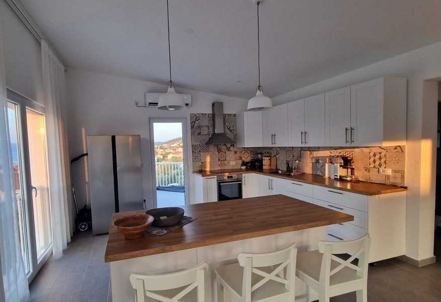 A felső szinten egy nyitott terű nappali található konyhával és étkezővel, egy további fürdőszoba és két fedetlen terasz, ahonnan csodálatos kilátás nyílik a környező szigetekre, a nyílt tengerre, Pelješacra és a St. Elias-hegyre.
