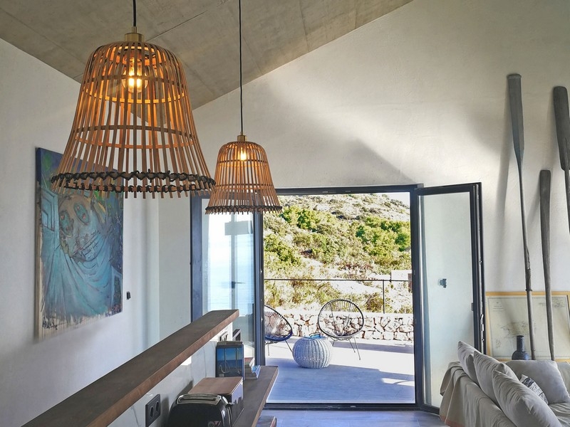 A 2021-ben épült villa Vis szigetén található, és elegáns, minimalista dizájnnal büszkélkedhet. A fehér beton és kő elemek kombinációja harmonikusan illeszkedik a mediterrán környezetbe, és kiemeli az ingatlan egyedi jellegét.