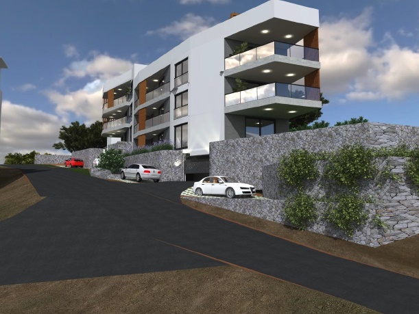 6. lakás (1. épület) a 2. emeleten, melynek lakóterülete kb. 95 m² (kb. 56 m² belső) a hozzá tartozó terasszal) és két hálószoba, fürdőszoba, nappali étkezővel és konyhával, erkély. Kijárat a tetőteraszra. Vételár: 335 000 euró