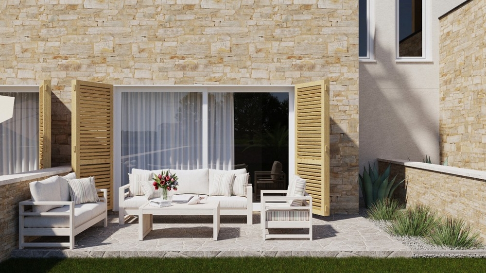 2. emelet: nappali, étkező, konyha, tároló, wc, 60 m²-es tetőterasz Főleg a felső teraszról gyönyörű kilátás nyílik a tenger partjára, ami csak kb. 120 méterre. Az apartmanok klímával, padlófűtéssel és parkolóhellyel felszereltek.