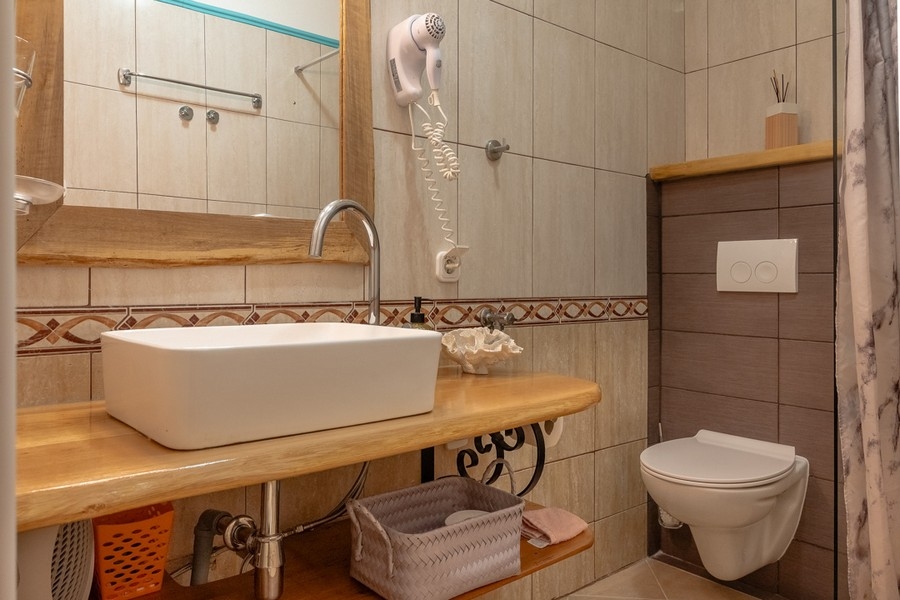 A lakás az első tengerparti sorban helyezkedik el, az épület pedig egy közös terasszal rendelkezik közvetlenül a part mentén. Ez a lakóegység a második emeleten (legfelső szinten) található, és kb. 47 m²-es lakóteret kínál, amelyben egy hálószoba, egy fürdőszoba, valamint egy nappali konyhával és étkezőrésszel található.